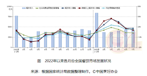 中國烹飪協(xié)會分析,7月份,全國餐飲收入、限上餐飲收入增速分別較上年同期上漲17.3%、12.1%。1-7月份,全國餐飲收入、限上餐飲收入增速分別比上年同期上升27.3個、28.2個百分點(diǎn)。