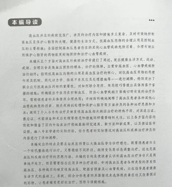 該書每一編都有一個導(dǎo)讀,指導(dǎo)讀者怎樣學(xué)習(xí)使用相關(guān)內(nèi)容,在閱讀每編、章、節(jié)前都能構(gòu)建好系統(tǒng)的理論知識框架,順利把握好各章節(jié)中的重點、難點及疑點,更好地汲取書中的教學(xué)方法及研究成果。如第四編“高血壓科疾病治療學(xué)”從健康生活方式、抗高血壓藥物、中醫(yī)藥、相關(guān)疾病處理和介入與外科手術(shù)等五個方面對高血壓科疾病治療學(xué)進(jìn)行了闡述。反映了高血壓涉及的疾病范圍廣,涉及的治療內(nèi)容和措施多且復(fù)雜,及時有效地控制高血壓是保護(hù)心腦腎的關(guān)鍵。健康的生活方式、抗高血壓藥物的合理應(yīng)用是控制血壓的主要措施;全面控制高血壓患者存在的其他心血管疾病危險因素、合理有效應(yīng)用保護(hù)心腦腎的藥物能更好地預(yù)防和治療心血管疾病。