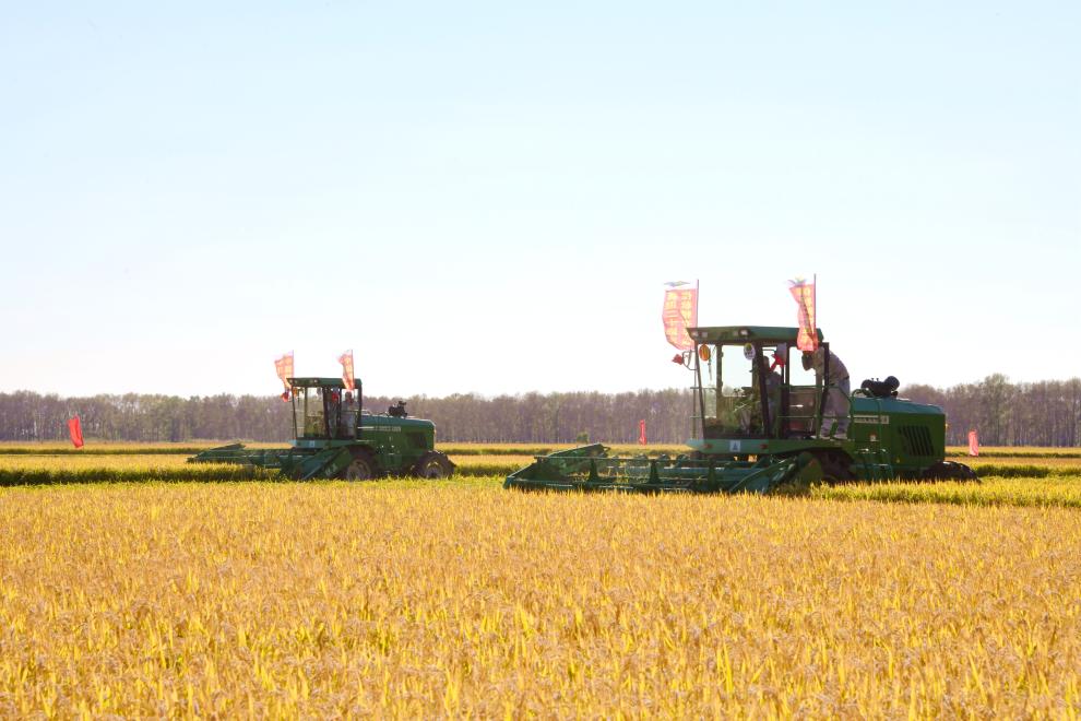北大荒集團(tuán)普陽(yáng)農(nóng)場(chǎng)有限公司第三管理區(qū)水稻種植綜合標(biāo)準(zhǔn)化示范區(qū)的割曬機(jī)分段收獲現(xiàn)場(chǎng)。(李道民 攝)