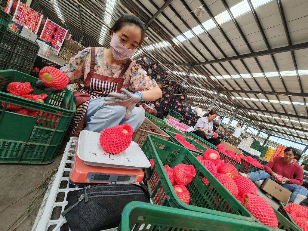 9月19日,會理市鹿廠鎮(zhèn)白草村農(nóng)產(chǎn)品物流園區(qū),務工人員正在分揀石榴果。新華社記者江毅 攝