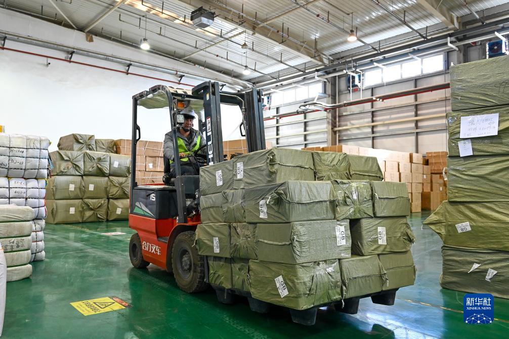 工作人員在新疆喀什綜合保稅區(qū)內(nèi)的中順電子跨境電商貨物分揀中心轉運出口的貨物(11月4日攝)。