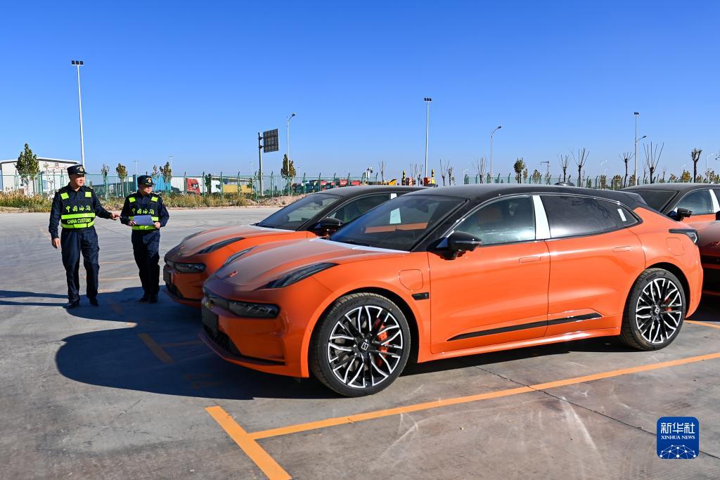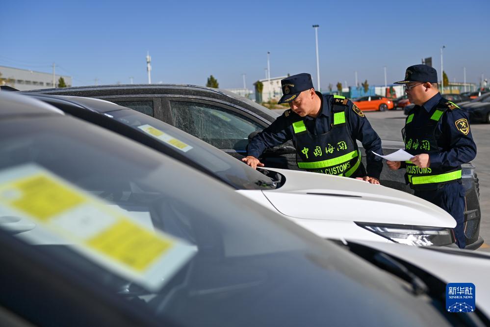 海關關員在新疆喀什綜合保稅區(qū)內(nèi)的海關施封集中查驗作業(yè)區(qū)查驗出口商品車(11月4日攝)。
