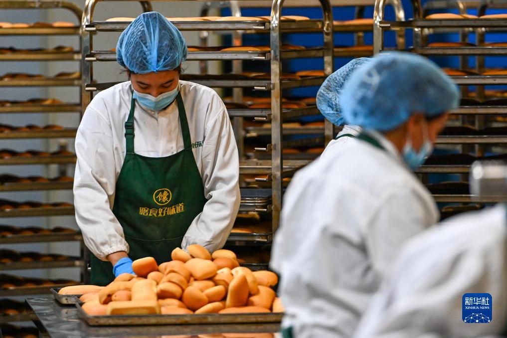 工作人員在新疆喀什綜合保稅區(qū)內(nèi)的新疆疆來美農(nóng)業(yè)科技有限公司分揀剛做好的糕點(11月4日攝)。