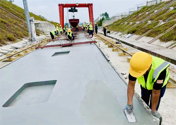 梅龍高鐵時(shí)速350公里,采用的是CRTS雙塊式無砟軌道結(jié)構(gòu),從上到下由鋼軌、扣件、軌枕、道床板、隔離層和底座等部分組成,無砟軌道的平整度決定著列車行駛的平穩(wěn)性和舒適性?;炷寥肽囟软毧刂圃?——30攝氏度才能確保質(zhì)量,為此項(xiàng)目部將施工作業(yè)時(shí)間進(jìn)行了調(diào)整,避開高溫時(shí)段,選在溫度偏低的早上和夜間施工,混凝土澆筑則在深夜溫度最低的時(shí)候進(jìn)行;確保無砟軌道施工質(zhì)量。