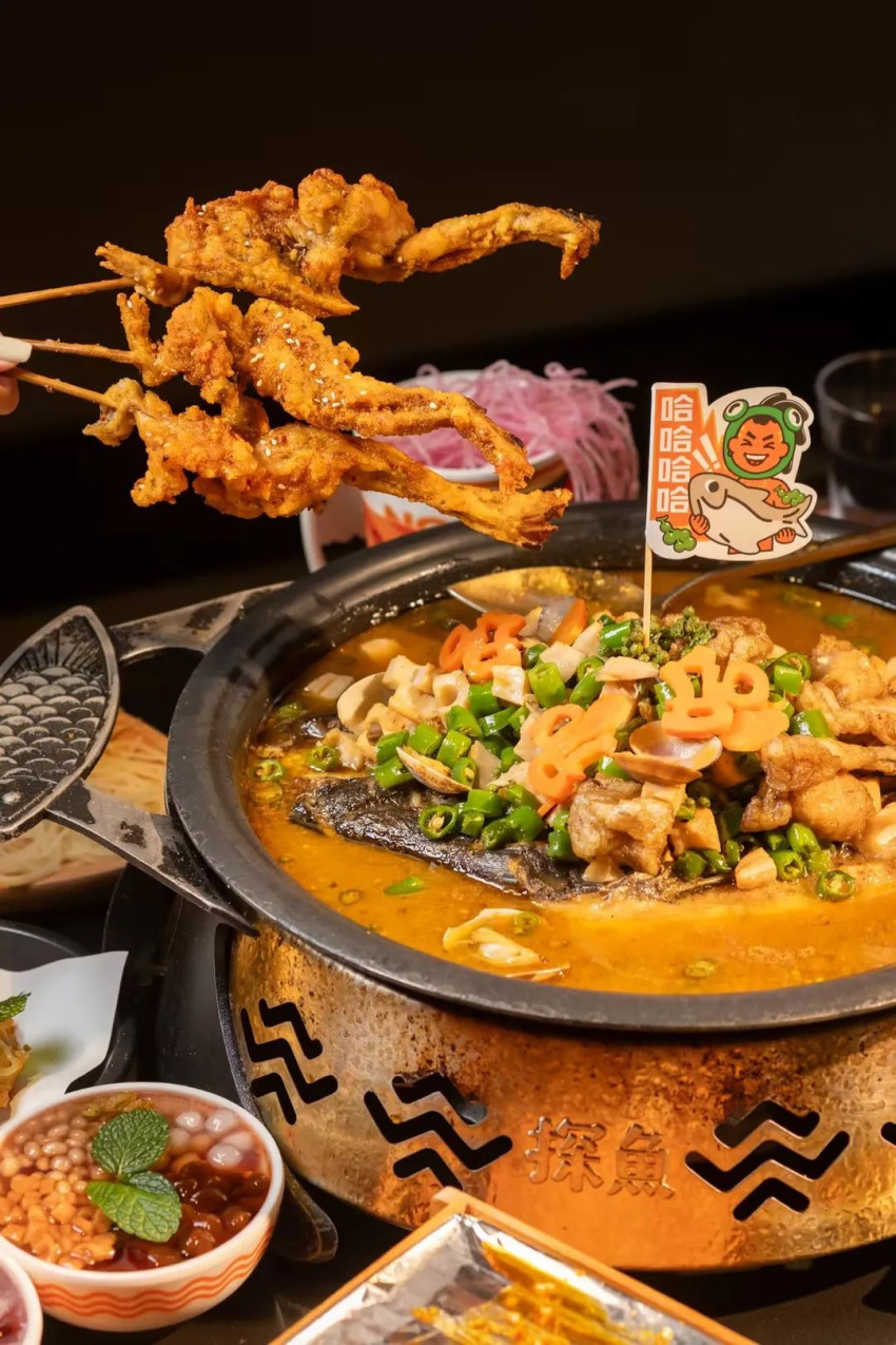 今年以來,探魚先是上新了“鮮青椒蔥蔥烤魚”,首次在鮮青椒爽麻烤魚的基礎(chǔ)上做了延展升級;又和WPS聯(lián)名上新了“麻辣鹵味烤魚”,豐富了辣味烤魚的味型;最新推出的鮮青椒蛙哈哈烤魚,不僅帶動了品牌營業(yè)額的同比增長,還吸引了不少消費者的打卡圍觀。