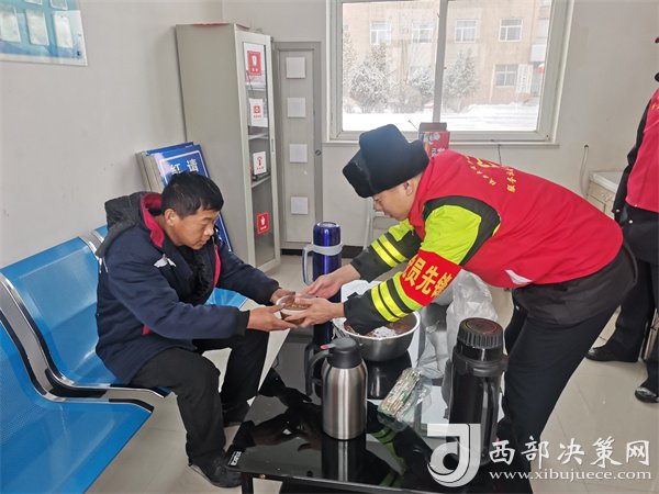 這有小米粥、炸油餅,雞蛋還熱乎著……”榆靖分公司志愿者暖心地喊著話。“行動是最好的破冰劑”,志愿者們?yōu)楦咚贉袈每退腿ナ澄铮旓L(fēng)冒雪分發(fā)給滯留在收費站的司乘人員。一件件穿梭在寒風(fēng)中的“紅馬甲”此刻成為了冬日里最美的“志愿紅”,讓群眾在寒意逼人的天氣里感受到了一份特別的溫暖。大家紛紛表示感謝,“熱粥、小菜、松軟的饅頭下肚,全身都熱乎了。”一名滯留司機真誠地感激道。