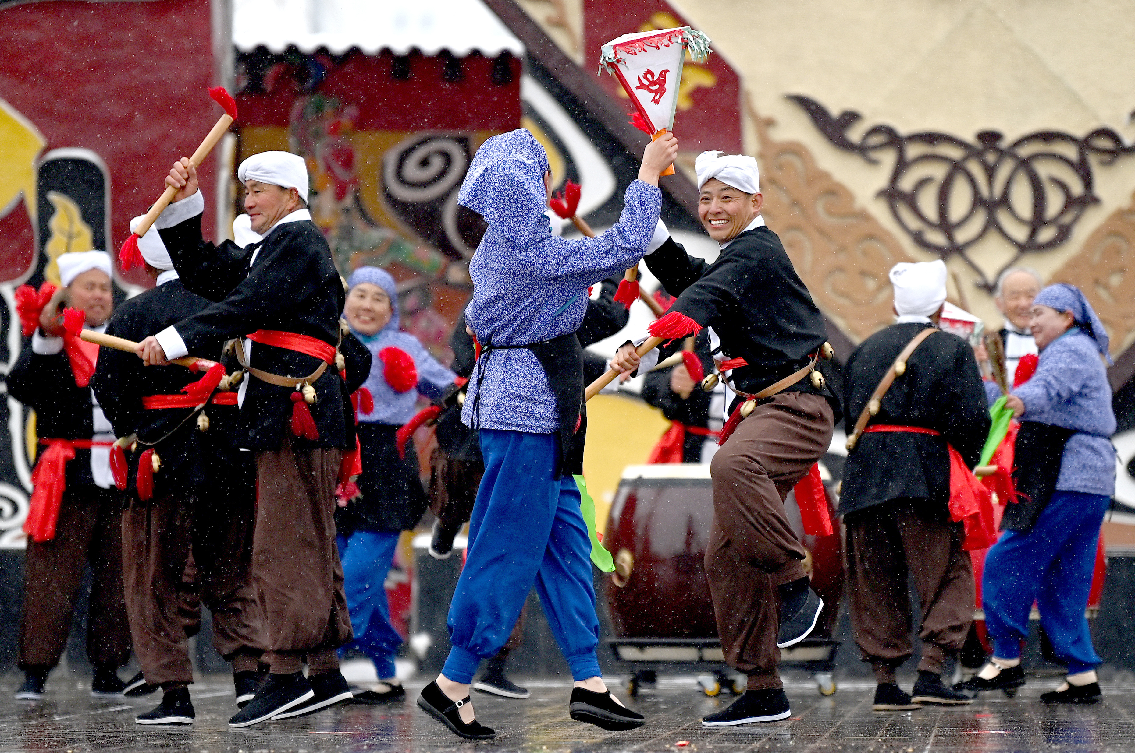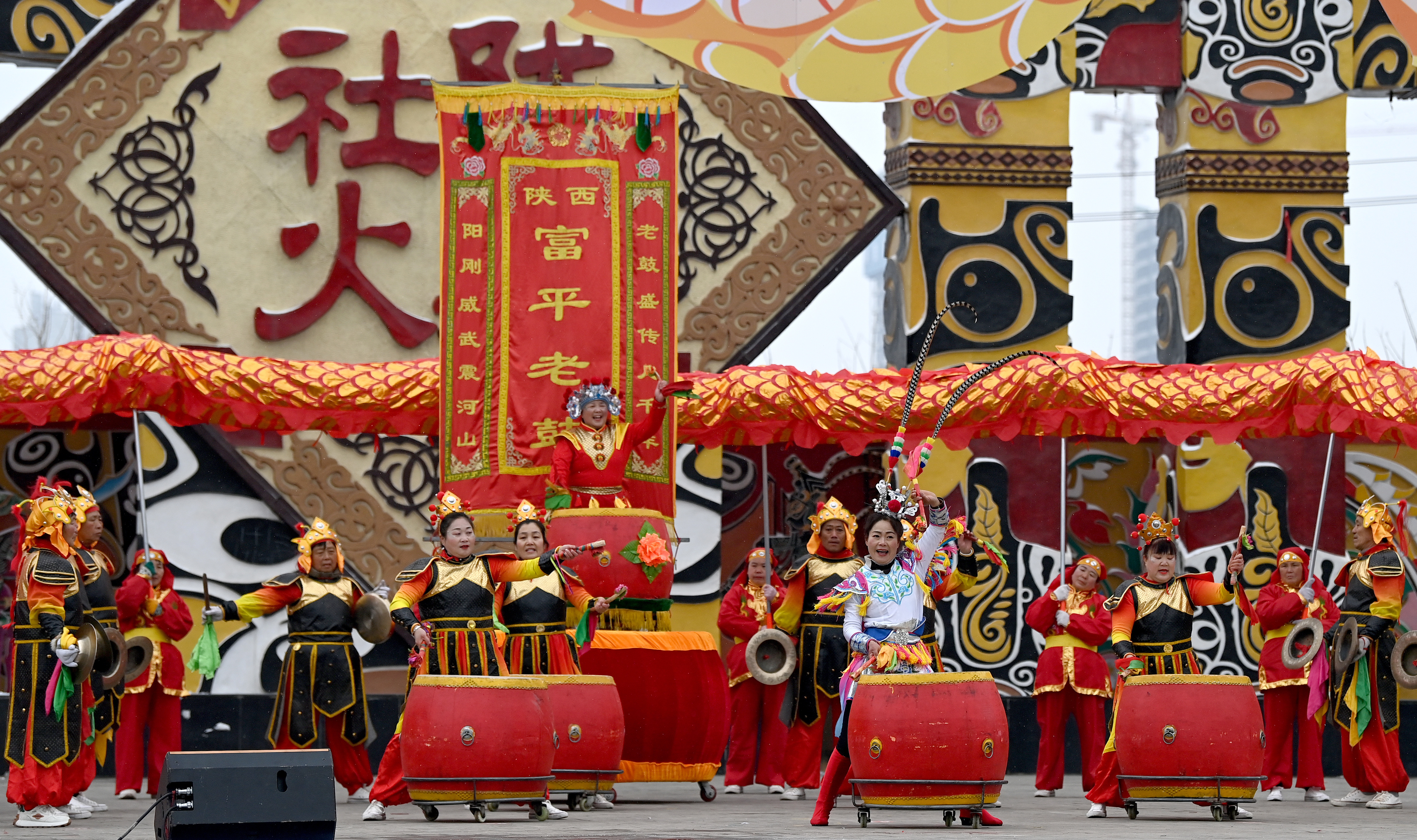 2月22日,在隴州社火過大年暨陜西省民間社火展演上,來自渭南市富平縣的社火隊在表演富平老鼓。新華社記者劉瀟攝