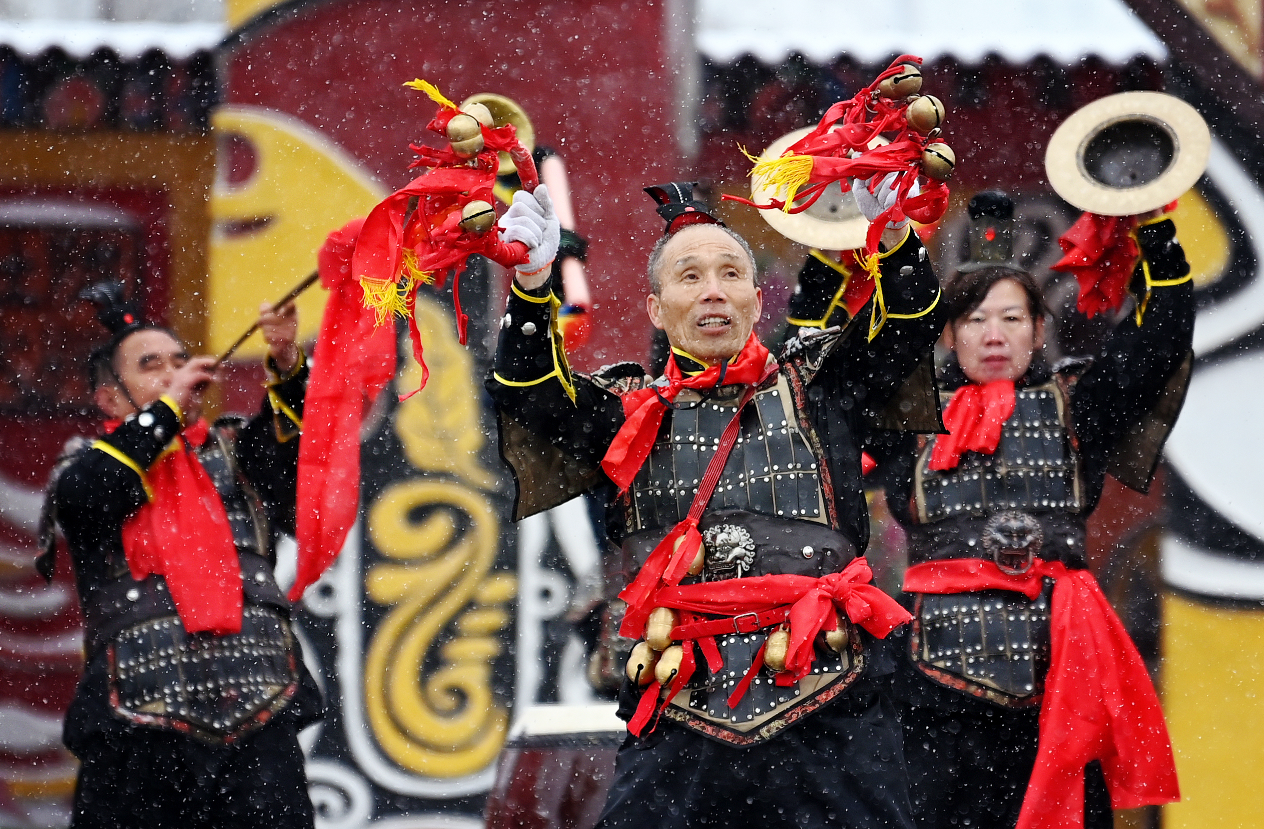 2月22日,在隴州社火過大年暨陜西省民間社火展演上,來自咸陽市的社火隊在表演秦漢戰(zhàn)鼓。新華社記者劉瀟攝