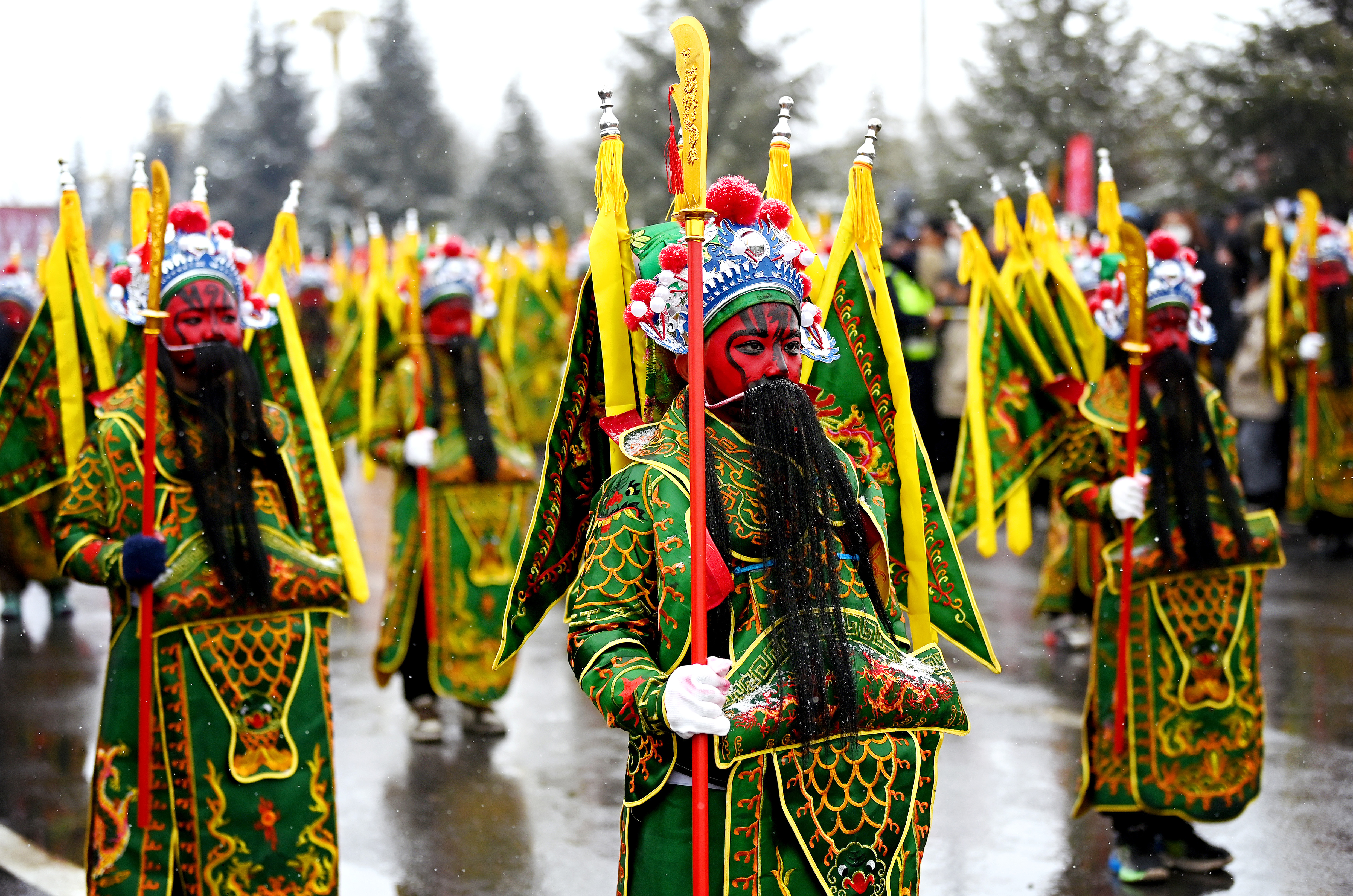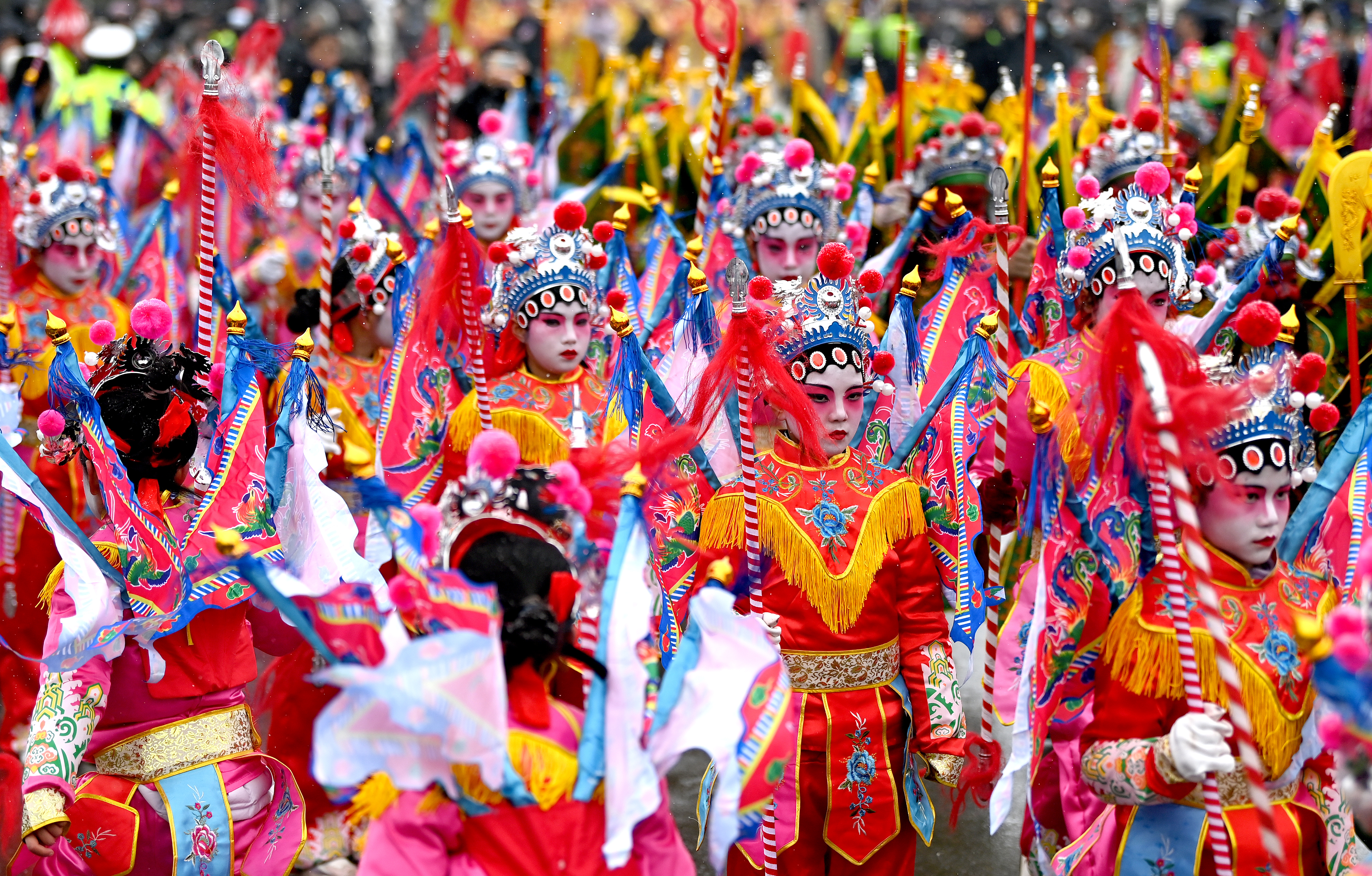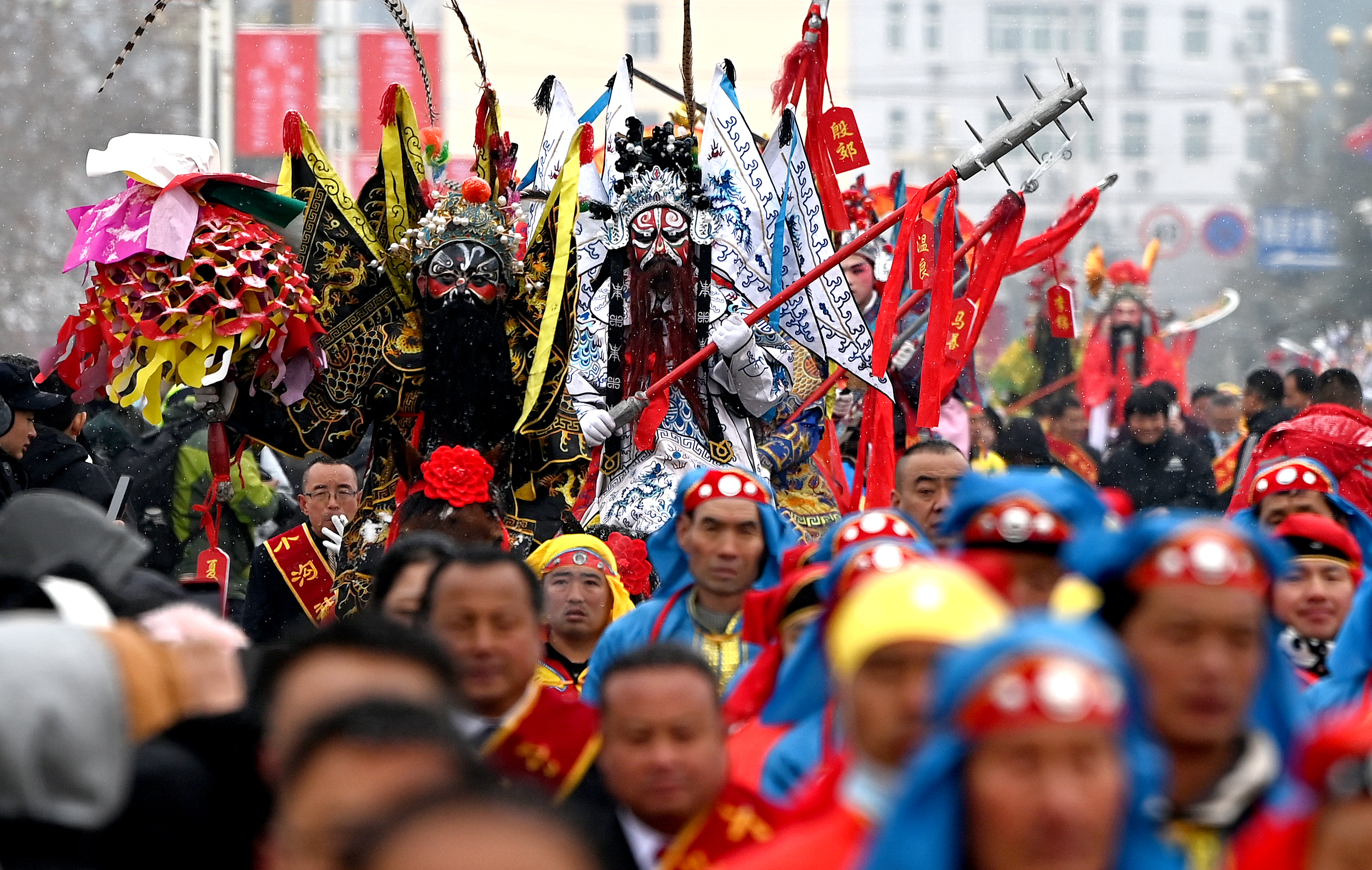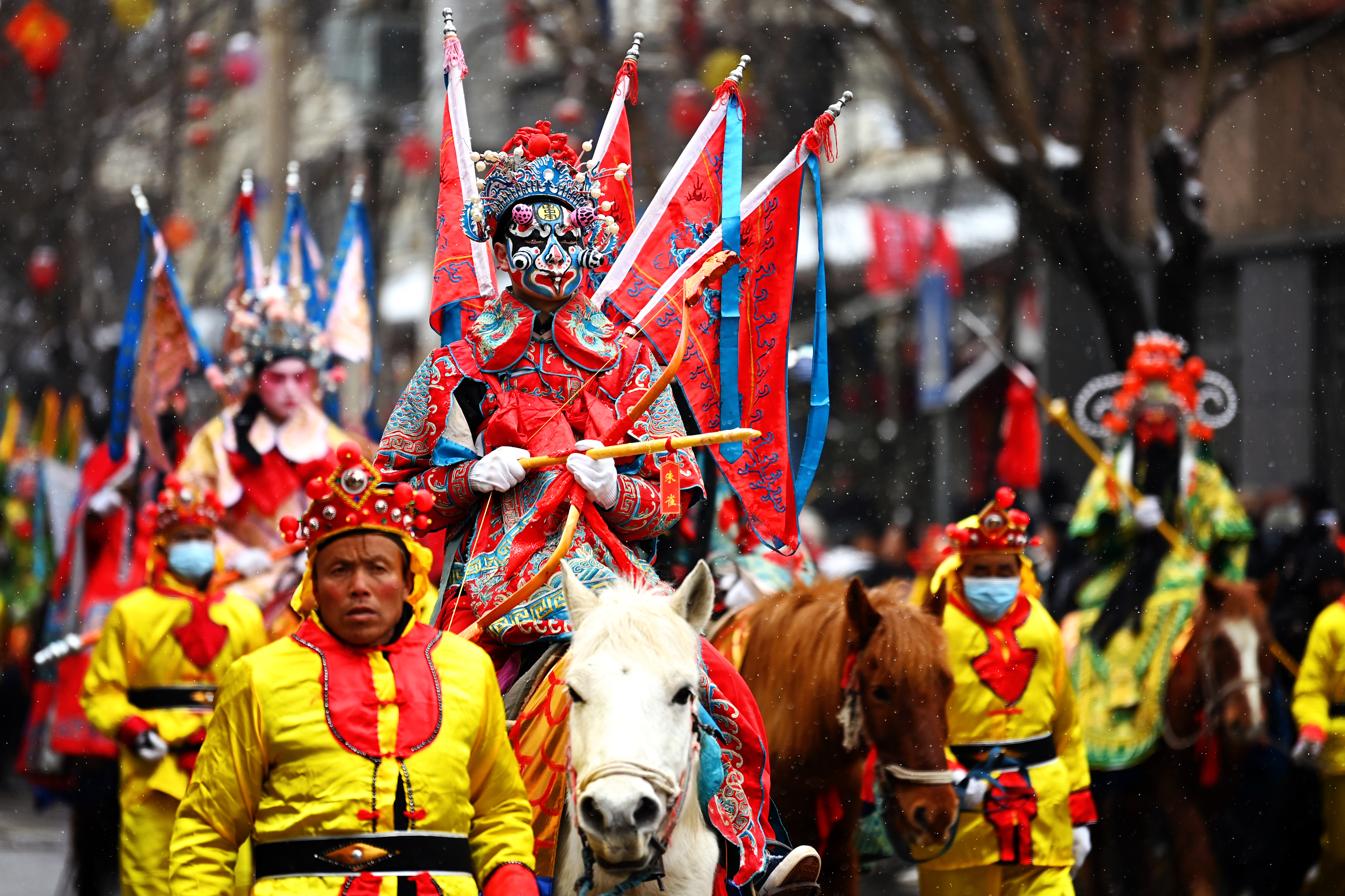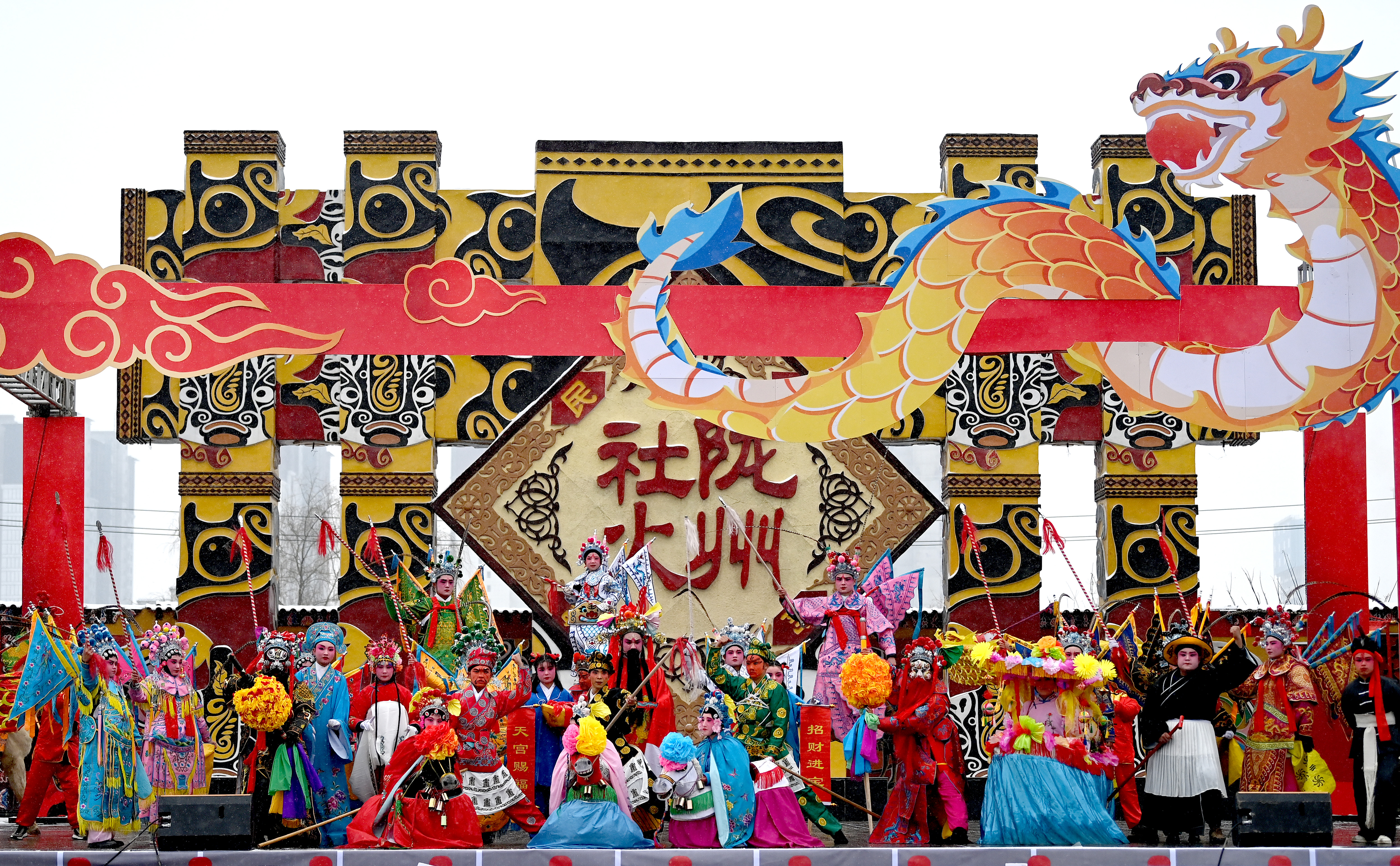 當(dāng)日是農(nóng)歷正月十三,來自陜西各地市的民間社火代表隊齊聚陜西隴縣,進(jìn)行社火展演及巡游活動。在陜西,每年春節(jié)期間人們紛紛裝扮社火,走鄉(xiāng)串戶,進(jìn)行拜年迎春游演。