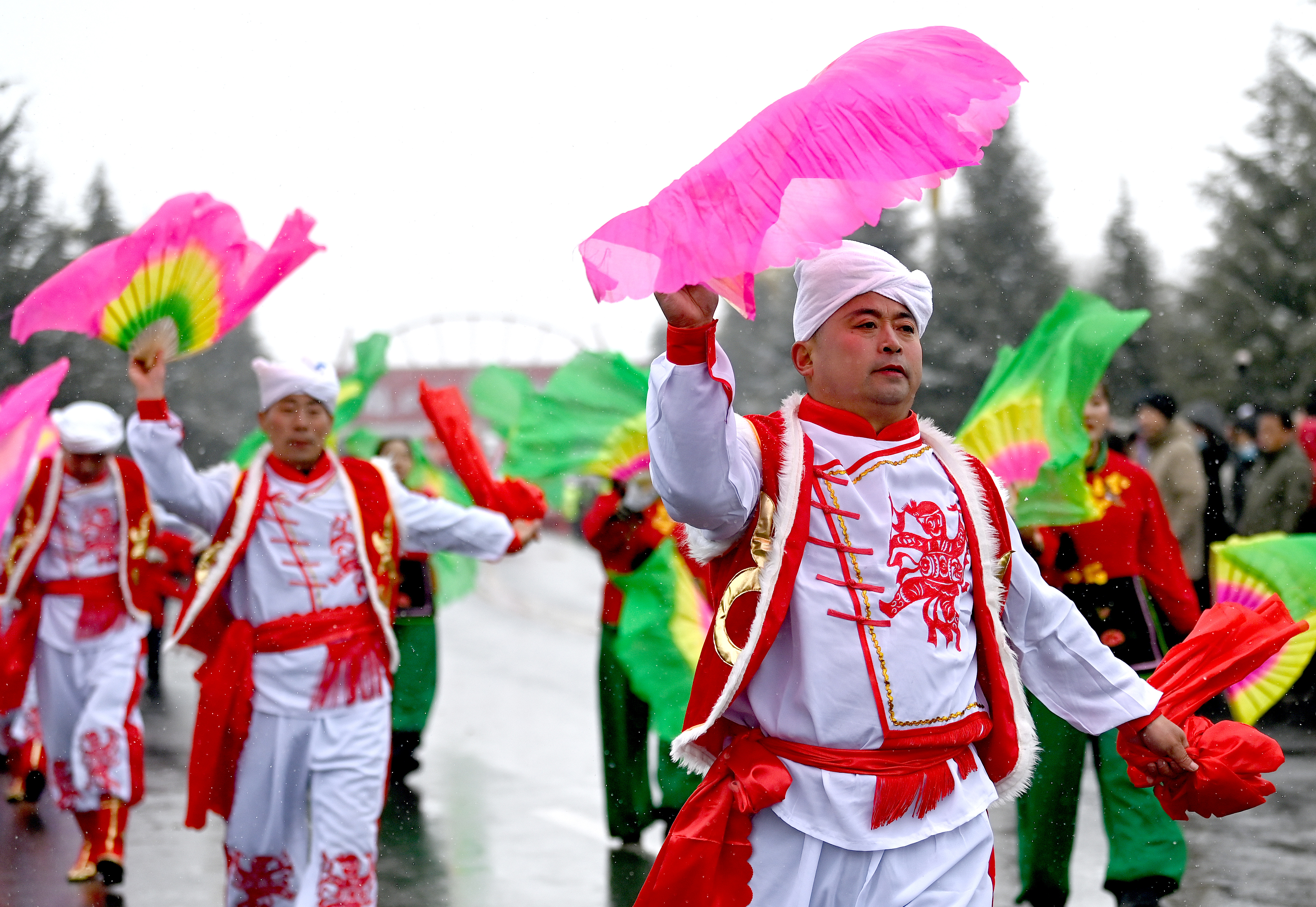 2月22日,在隴州社火過大年暨陜西省民間社火展演上,來自榆林市的社火隊在表演子洲秧歌。新華社記者劉瀟攝