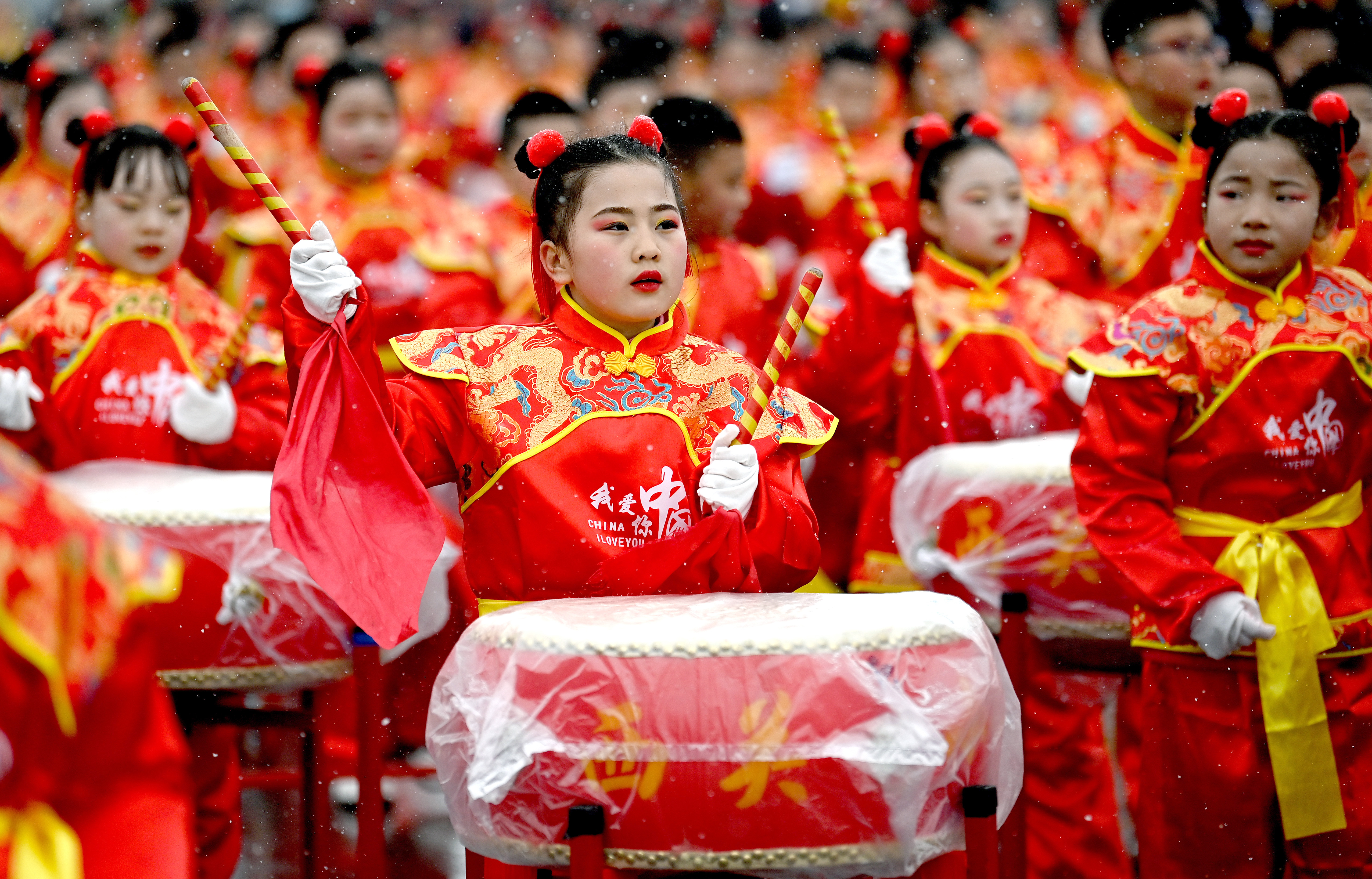 2月22日,在隴州社火過大年暨陜西省民間社火展演上,隴縣百人少兒鑼鼓隊在進(jìn)行巡游。新華社記者劉瀟攝