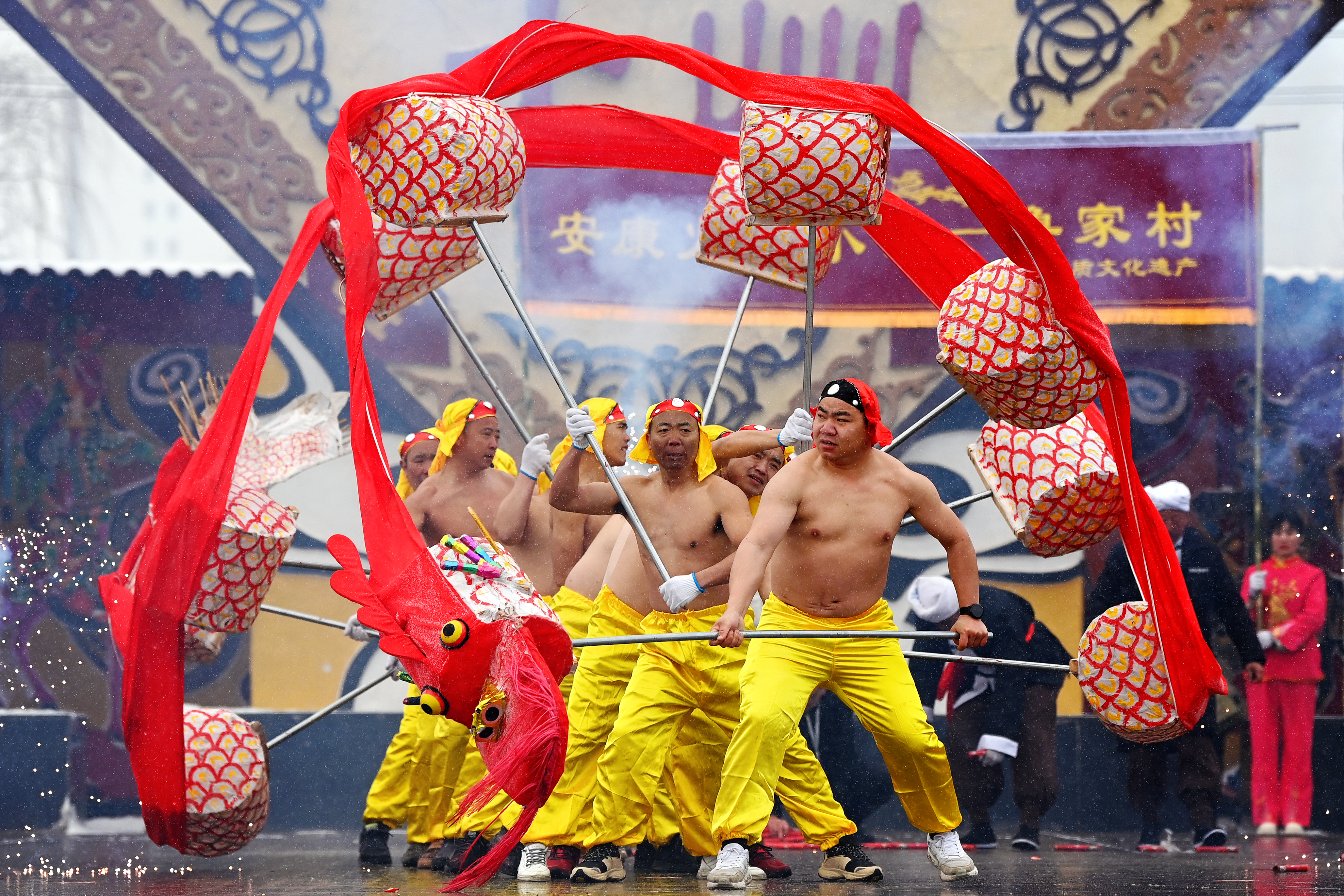 2月22日,在隴州社火過大年暨陜西省民間社火展演上,來自安康市漢濱區(qū)的社火隊在表演魯家村火龍。新華社記者劉瀟攝