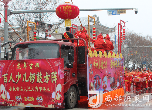 集中展演之后,全省各地社火與隴縣裝扮的百面旗林、百面鼓隊(duì)、百人馬社火、百人少兒鑼鼓、百人少兒社火、百人地臺社火和特色社火、車社火、高芯社火方陣沿縣城迎賓大道--東大街--西門口--新建路--千邑大橋進(jìn)行巡游,讓大家感受了社火的獨(dú)特魅力,為大家送去新春的祝福。