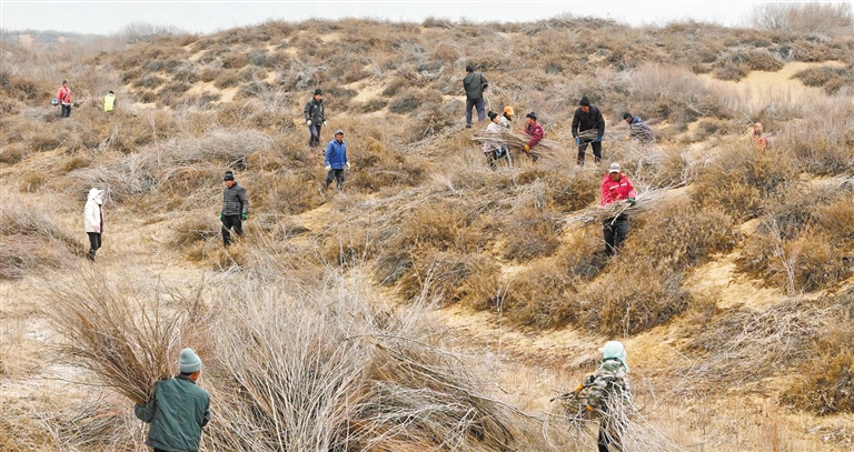 3月5日,在榆林市榆陽區(qū)小壕兔鄉(xiāng)掌高兔村,技術(shù)人員在進行沙柳平茬作業(yè)。