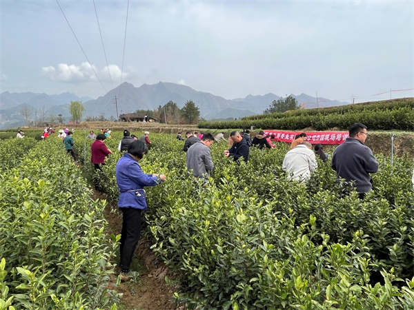 山間云霧繞,茶園綠意濃。在采摘場內(nèi),千畝茶園新芽吐露,一排排整齊的茶樹如同“綠毯”鋪滿了漫山遍野,縣茶技站專家對采摘技術(shù)進行了現(xiàn)場培訓(xùn),采茶工人熟練地采摘著新茶,豐收的喜悅洋溢在她們的臉上,時時回蕩著不一樣的“茶語花香”。