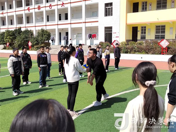 康陽陽老師在體育匯報課上為學(xué)生講解排球擊球要領(lǐng)