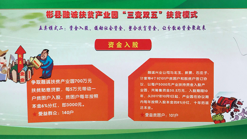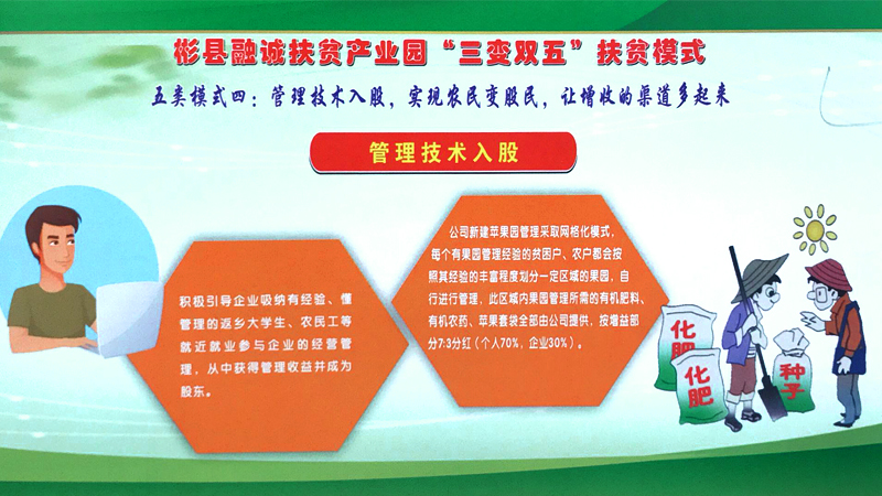 彬州融誠(chéng)集團(tuán)公司按照“企業(yè)主導(dǎo)、政府搭臺(tái)、群眾參與、社會(huì)共建”的思路,圍繞主導(dǎo)產(chǎn)業(yè),緊盯市場(chǎng)需求和脫貧政策動(dòng)向, 在外出考察學(xué)習(xí)的基礎(chǔ)上,借鑒貴州省六盤(pán)水市“三變”改革的成功經(jīng)驗(yàn),以“資源變資產(chǎn)、資金變股金、農(nóng)民變股東”三變改革為基礎(chǔ), 探索總結(jié)出了符合融誠(chéng)實(shí)際的“三變雙五”新模式。